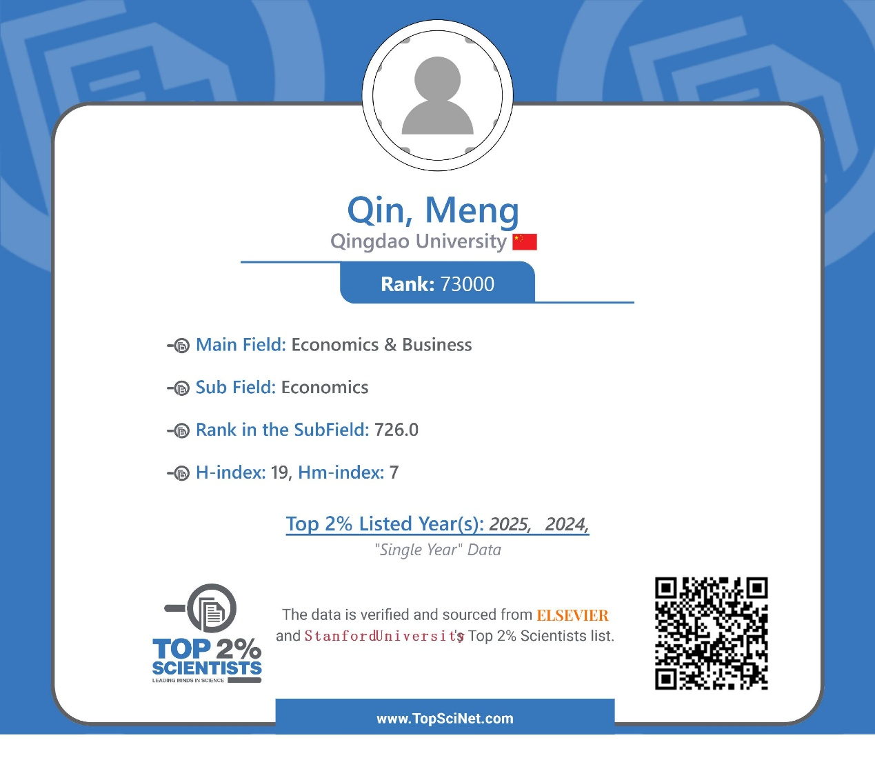 秦梦副教授再次入选榜单,位列全球经济学子学科排名726位(总31685人),与2024年排名1804位(总47525人)相比有大幅提升,实现18禁