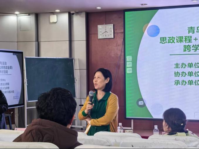 第四部分由青岛市市南区教育研究中心刘华艳老师进行活动总结,刘老师肯定了各位老师的教学思路,提到以跨学科协同育人提升思政课程的引领力,跨学科的最终目的就是要做果汁式的协同育人,你中有我,我中有你。刘老师指出知识的传授可以借助AI去实现,但是育人一定是教师亲力亲为。